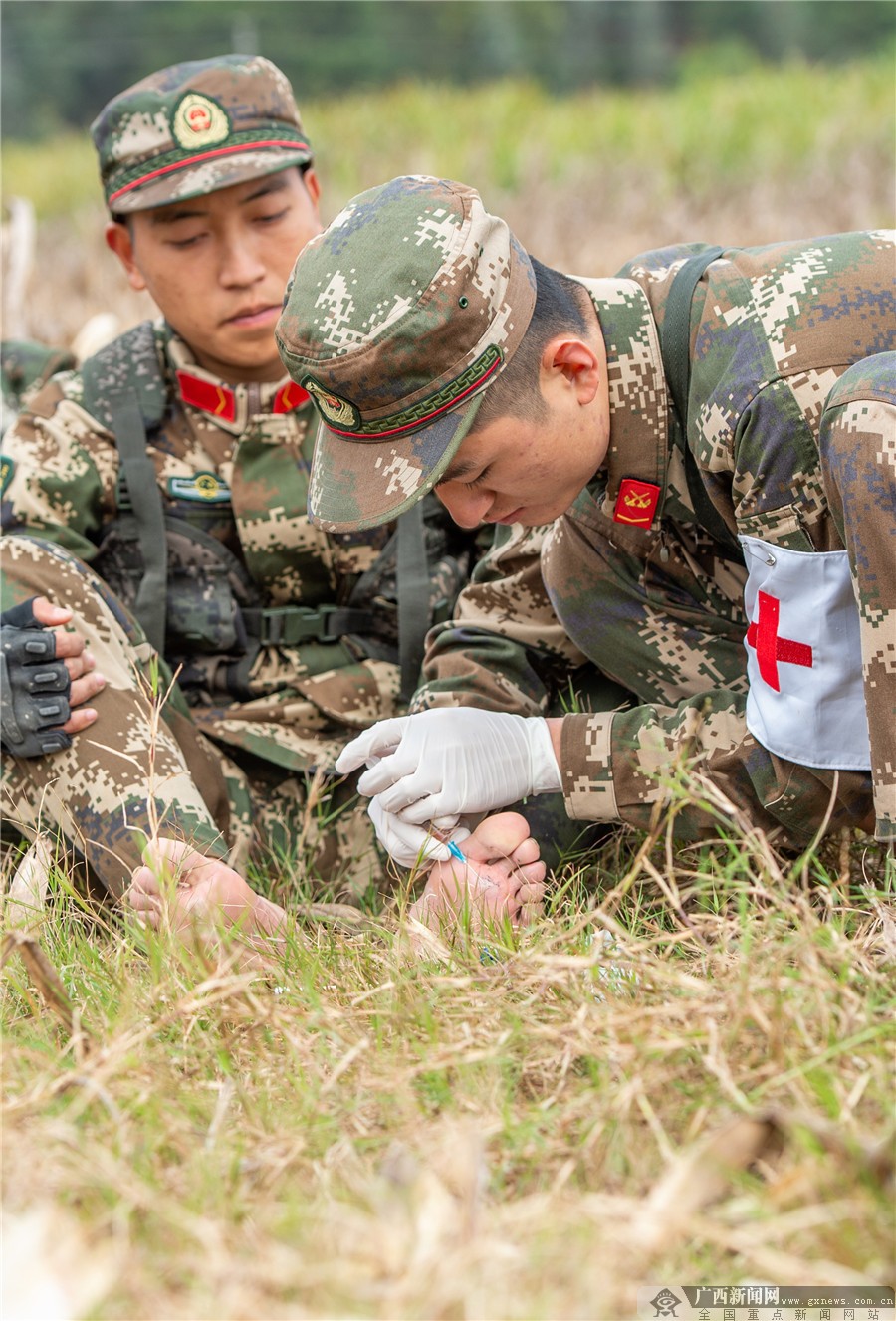 一名卫生员正在为新兵挑水泡。广西新闻网通讯员 任旺 摄