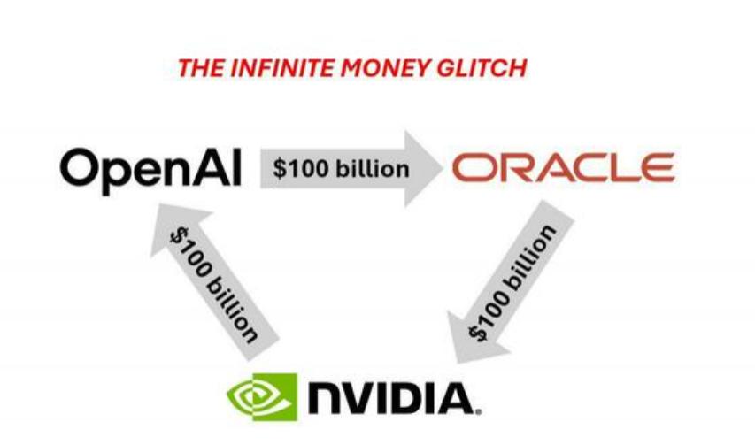 摩根大通分析师 Michael Cembalest 在他最新的《市场观察》报告中,精辟地描述了这种被许多同行称为 " 无限金钱漏洞 "(infinite money glitch)的 AI 循环经济。
