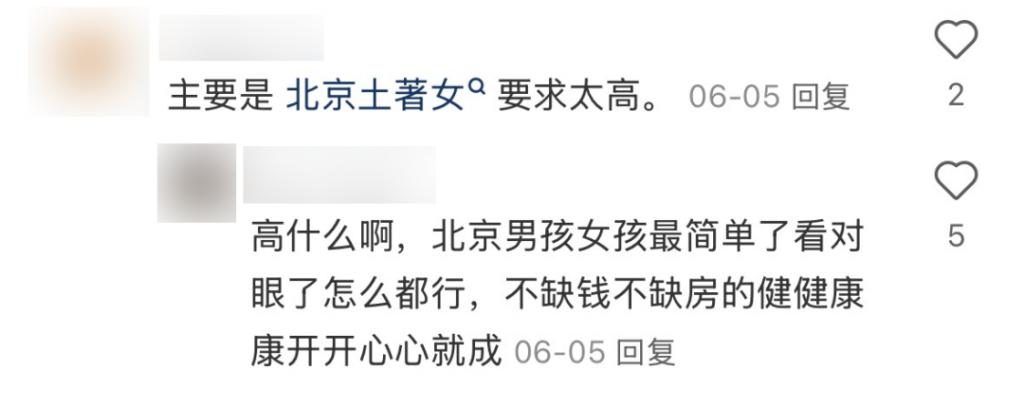 " 条件比你好的,压根不 care 户口在哪儿,尤其那些老家几代积累的县豪门,反而觉得北京户口是束缚;条件不如你的,天大地大哪不能闯,何必为你困守一方;剩下那几个门当户对的北京男生,早就被抢得差不多了。"