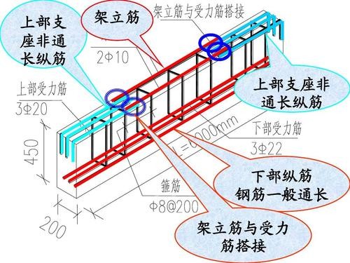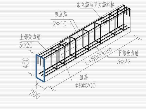 4、架立筋:架立筋是构造要求的非受力钢筋,一般布置在梁的受压区,并且直径较小。当梁支座处的上部布置有负弯矩钢筋时,架力筋可只布置在梁的跨中部分,两端与负弯矩钢筋搭接或焊接。与受力筋搭接长度为150mm。在设计时梁上部如果需要布置受压纵筋时,受压纵筋可兼作架立钢筋。架立筋的作用只是为了固定箍筋。