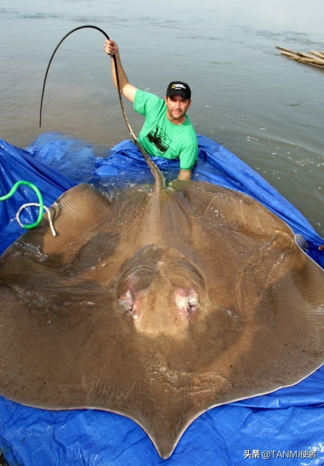 这应该是人们捕捞到的最大的淡水鱼了,是由美国生物学家扎布·霍根在柬埔寨湄公河中捕获的,长达4.27米,重达726斤,15个成年人花了约6个小时才将它拖出水面,可见它的力量大到惊人。