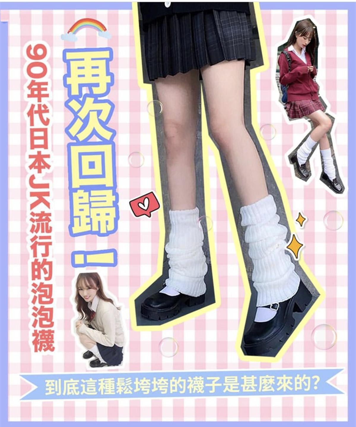 但是我们也知道袜子在穿的时候,如果提得太靠上,时间久了就会变得松垮垮,看起来皱巴巴的。于是就在不经意间形成了一款潮流与时尚,就成为了日本女女学生在穿JK服的时候最喜欢搭配的最佳拍档。