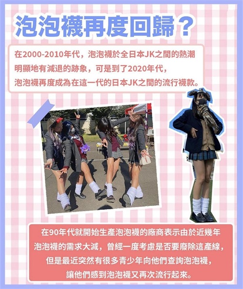 就如同二次元的喜好一样的,流行一段时间以后进入了一个衰退期,尤其是十年前就连生产泡泡袜的厂商都认为泡泡袜快不行了。不过不知道为什么最近又重新流行了起来,或许这就是时尚潮流的规律,每隔一段时间其实并不一定会有什么新的元素,只是把过去已经过时的元素又翻出来再流行一次。