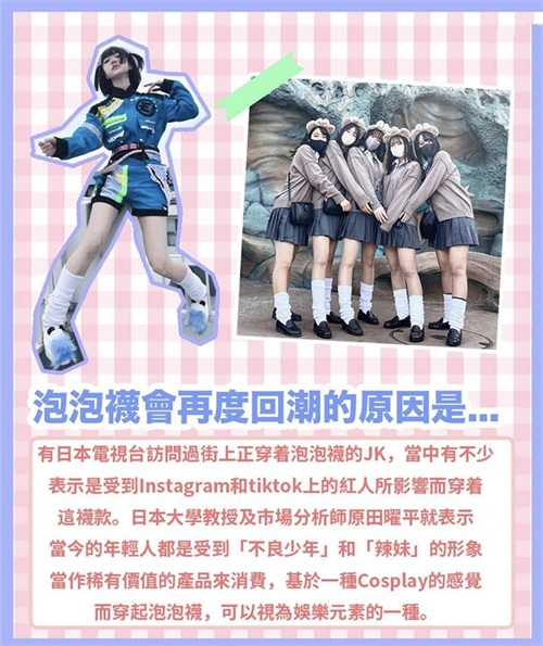 它最初的目的真的是为了搭配PK服吗?显然不是的,泡泡袜最初确实是来源于日本的。但是它的目的并不是为了搭配JK服,使之看起来更好看,而是为了保暖。这种长长的袜子一来很贴身,二来看起来很厚实,在一些比较寒冷的山区用来作为腿部的保暖效果是非常好的。