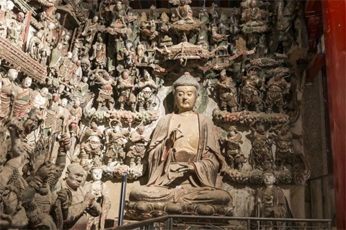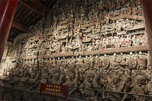 整个壁塑群可谓包罗万象,殿内壁塑群把绘画、圆雕、浮雕、镂刻艺术手段融为一体。