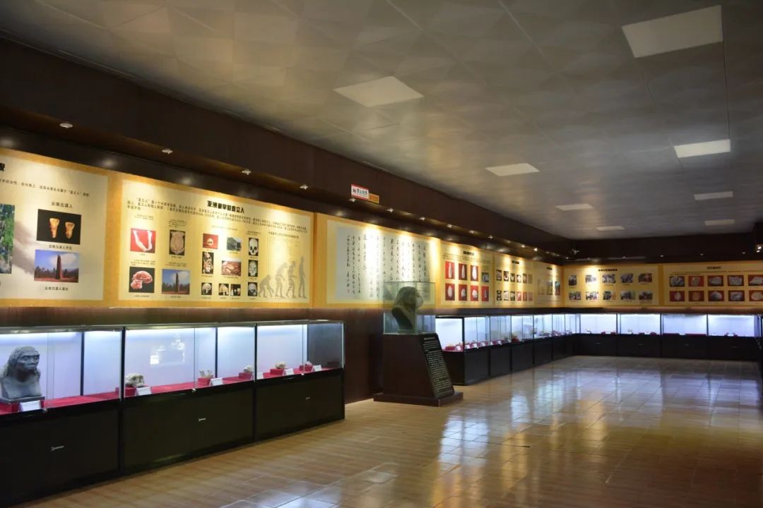 展厅内有展品百余件,包括蓝田猿人头盖骨化石(复制品),旧石器以及比旧石器时代更早的地层石等各类化石、石器,另有蓝田剑齿虎、三门马、原始牛等动物化石。