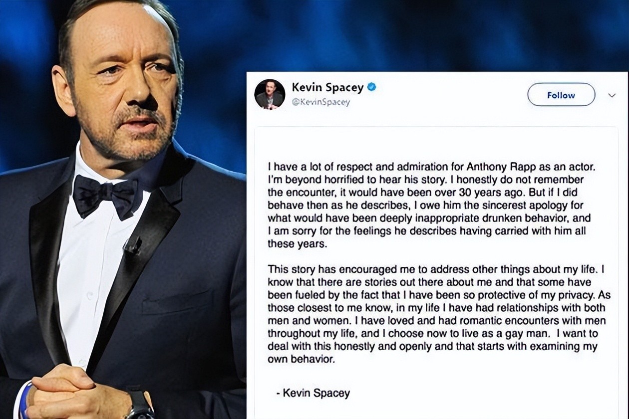 史派西是两届奥斯卡影帝,也是流媒体巨头Netflix的王牌剧《纸牌屋》(House of Cards,2013-2018年)男主角的扮演者,凭借此剧获得了金球奖剧情类剧集最佳男主角的荣誉。2004-2015年,史派西还是英国大型独立剧院——“老维克(Old Vic)”剧院的艺术总监。他是名副其实的戏骨,然而在2018年之后他的事业一落千丈,处于被好莱坞抛弃的窘境,就是因为他在英、美两国深陷性侵丑闻的泥沼,面临多起相关指控。