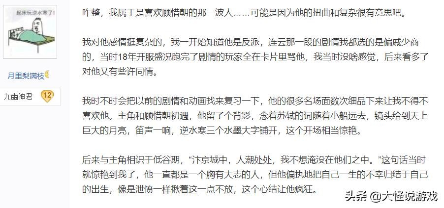 总之,喜欢顾惜朝地对他表示一万个理解,而恨他的恨不得暴揍他一万遍,能够塑造出这么个令人爱恨交加的人物,逆水寒剧情也算是同行天花板了。