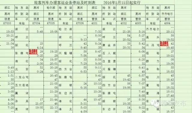 04031次由哈东,4031次、04032次由滨江,4032次由黑河,自5月15日按新时刻运行。