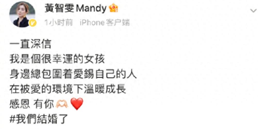在5日晚上,黄智雯罕见使用多个社交平台官宣喜讯,透露自己跟男友已经正式结婚,还开心的感叹自己是个幸运的女孩,被爱包裹长大,言语中非常开心。
