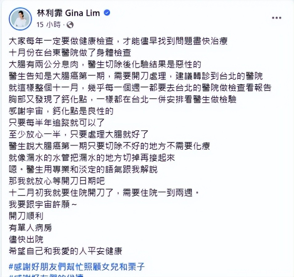 事情发生在10月,林利霏做了例行的健康体检,在台东医院检查时,意外发现大肠内长了一个2公分的息肉。经过切除和化验后,结果不容乐观——恶性肿瘤,初步诊断为大肠癌一期。
