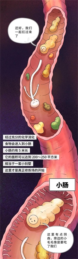 小肠约有5米长它的面积可以达到200~250平方米相当于一套小别墅。这里才是真正修炼场的开始,在这里,食糜中蛋白质、脂肪、碳水被进一步分解的营养物质大部分会在这里被吸收。