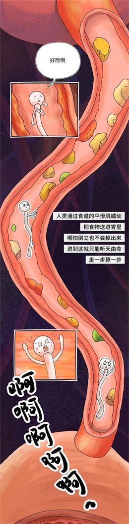 食物会在人类口腔中进行第一道机械加工,牙齿真的挺厉害的可以进行切割、碾磨,不过不少人类都没什么耐性,所以有些东西就能顺利在这一关留个「全尸」。人类通过食道的平滑肌蠕动,把食物送进胃里,哪怕倒立也不会掉出来,进到这里就只能听天由命。