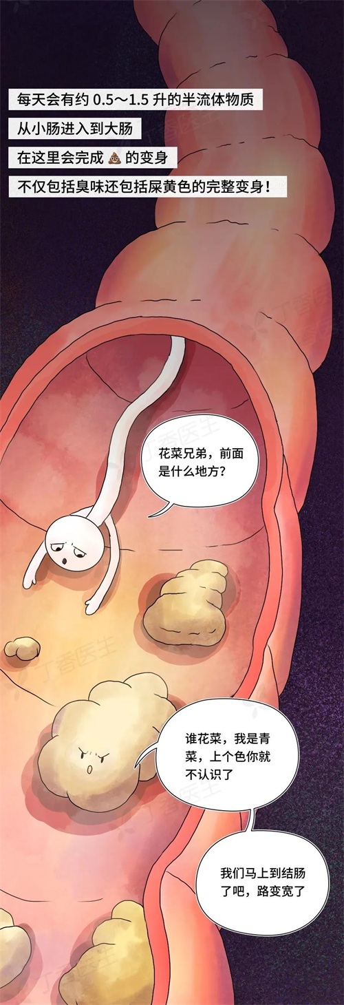 通常食物在胃里会待2~4小时,这是食物进入人体后的第一个大劫。大部分食物被拆解变成黏糊糊的一团食糜,经过充分的化学消化食物会进入到小肠。每天约会有0.5~1.5l的半流质物从小肠进入到大肠,在这里会完成屎的变身。