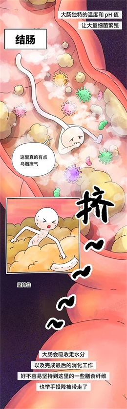 剩余的物质进入大肠,大肠独特的温度和pH值让大量细菌繁殖,大肠会吸收走水分以及完成最后的消化工作。