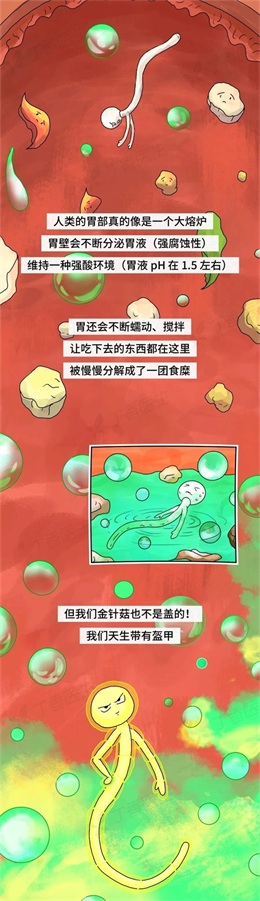 人类的胃部真的像是一个大熔炉胃壁会不断分泌胃液(强腐蚀性)维持一种强酸环境(胃液pH在1.5左右)。胃还会不断蠕动、搅拌让吃下去的东西都在这里被慢慢分解成了一团食糜,但金针菇也不是盖的!金针菇天生带有盔甲,金针菇的身体主要是水(90%),还有一些蛋白质(2.4%)和可以消化的碳水化合物(6.5%)。外壳是膳食纤维壳多糖(又叫几丁质)是组成虾、蟹等甲壳类动物壳的主要成分,很难被消化的。