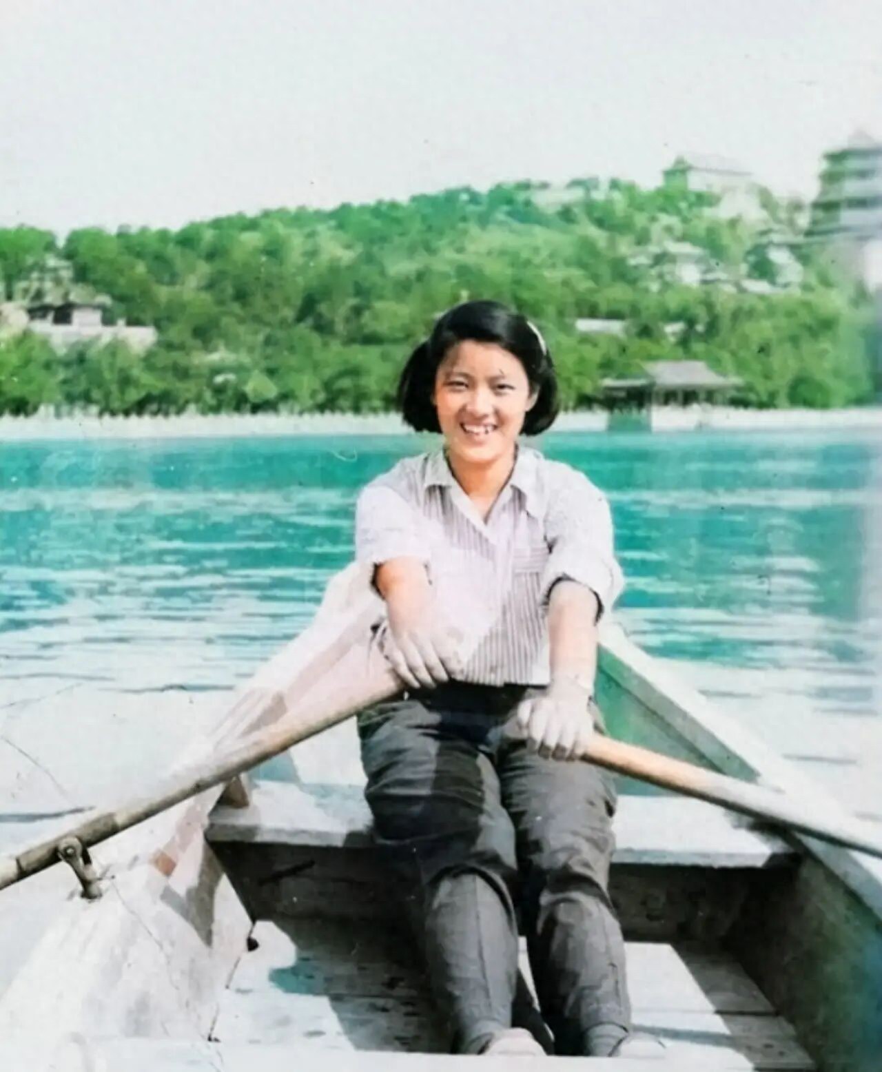 章含之年轻时在颐和园划船时的珍贵照片!这时的章含之年轻有朝气,面带笑容,露出洁白的牙齿,留着短发学生气息浓厚,自由自在在湖中荡起双桨,宛如一幅美丽的画卷。