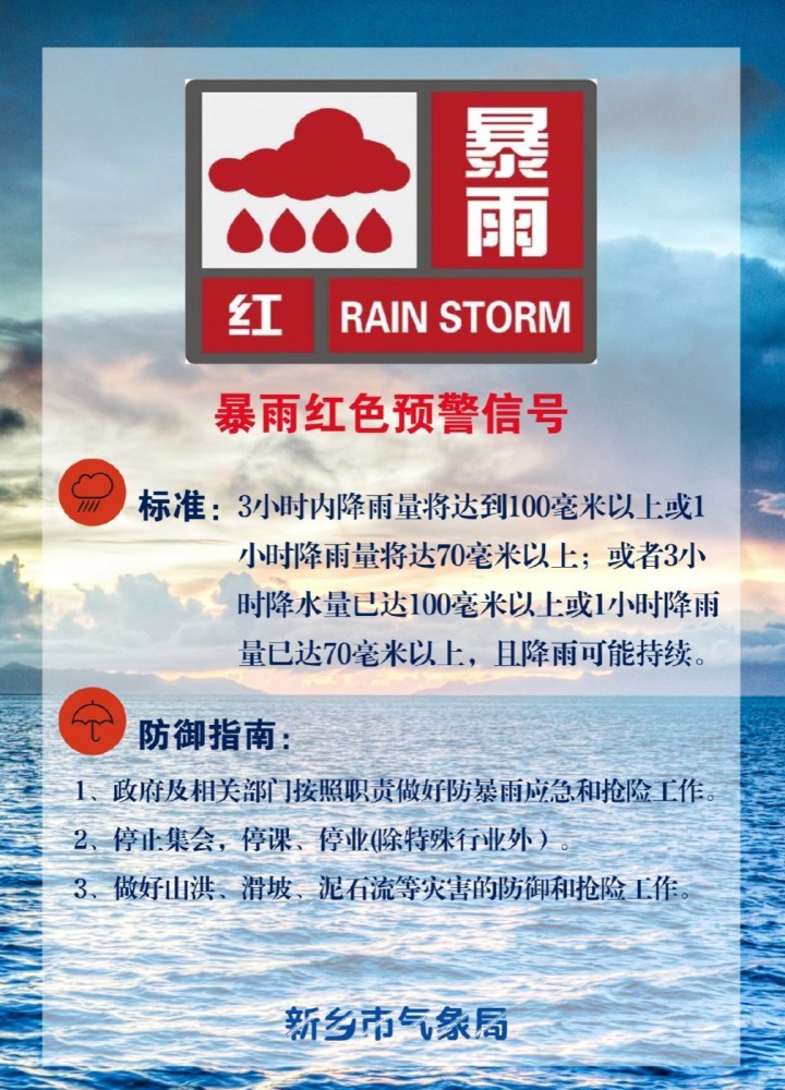新乡市气象台于7月22日4时30分继续发布暴雨红色预警信号:预计未来3小时内,我市全区强降水持续,累计降水量将达100毫米以上,强降水可能引发城市内涝和山区地质灾害。