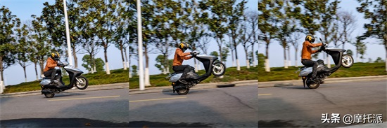 “喜鲨125”其实并不像外表那样温驯,下面这组照片,是摄影师叫着“外拍终于结束了”之后,我将重心后移,随手猛拧油门被抓拍到的。能一气呵成地做个抬头,真不是什么车都能轻松实现的,这需要足够给力的低扭。就凭这一点,我就能接受它所有的不足之处;这种来自所谓“老爷代步车”的意外体验,和“扮猪吃老虎”的奇妙经历,非常符合我这种“鬼火”中年的气质。
