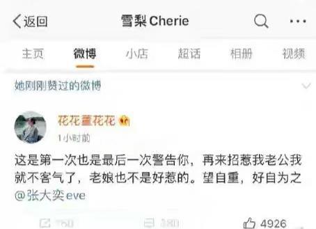 博文中如此说道"这是第一次也是最后一次警告你,再来招惹我老公我就不客气了,老娘也不是好惹的。望自重,好自为之@张大奕eve"。