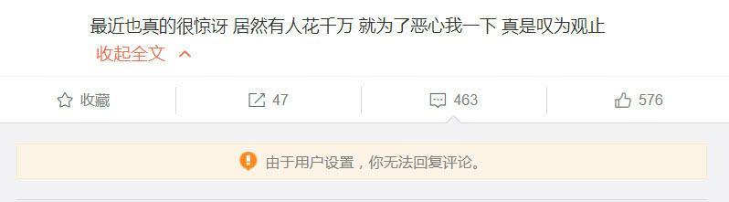 随后张大奕还在自己的微博小号上表示"居然有人花千万,就为了恶心我一下,真是叹为观止"。