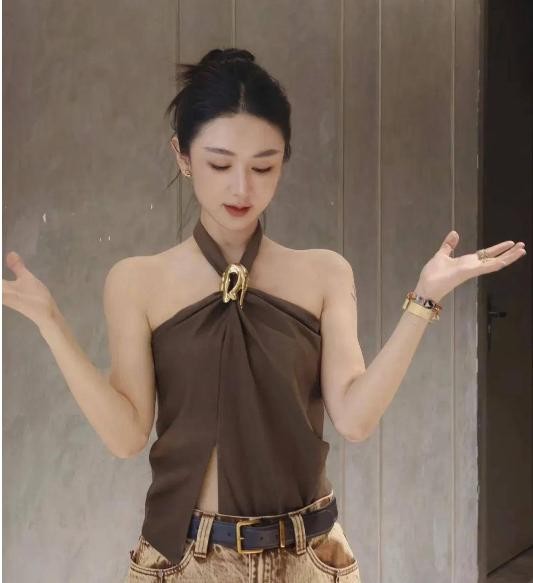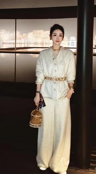 薇娅在当天的活动现场,穿着一身米白色的针织套装,腰间搭配着一条非常精致的金色腰带,衬得她整体的身体比例很完美。