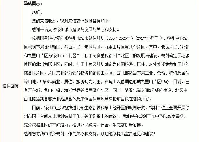 关心北区的居民面对日新月异的城市面貌,在徐州市人民政府网站“书记信箱”留言,询问北区发展的规划,并得到了徐州市自然资源和规划局的回复。