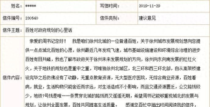 市民在信中说:我是咱们徐州北城的一位普通百姓,关于徐州城市发展规划想向您提供一点点城北百姓的心愿,徐州最近几年发现飞速,城市基础设施建设和环境综合治理的进步百姓有目共睹,我也了解市政府关于徐州未来发展规划的方向,徐州向东向南发展的红红火火,关于地铁的规划也是重中之重,可唯独徐州北城区,北三环和西三环北部,自从高架桥建设完毕之后仿佛没有了动静,无重点教育资源,无大型医疗医院,无综合商业资源,百姓看病,就业,生活购物只能舍近而求远,对生活造成不小影响,而且交通资源匮乏,公交路线较少,地铁7号线是唯一一条贯穿北城的路线而又遥遥无期,希望周书记能够重视城北的发展与规划,让徐州全面发展,百姓共同提高生活质量。