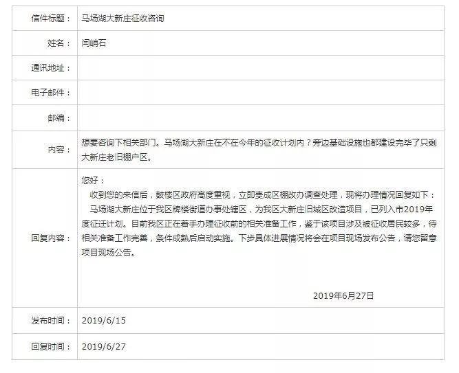 从2015年,大新庄村就传出了要拆迁的消息,不过直到现在也没有正式拆迁。好在今年6月份,有人在徐州市鼓楼区区长信箱中咨询马场湖大新庄什么时候征收的问题。对此,鼓楼区区长信箱中回复称,大新庄已经列入市2019年度征收计划,目前正在着手办理征收前的相关准备工作 。