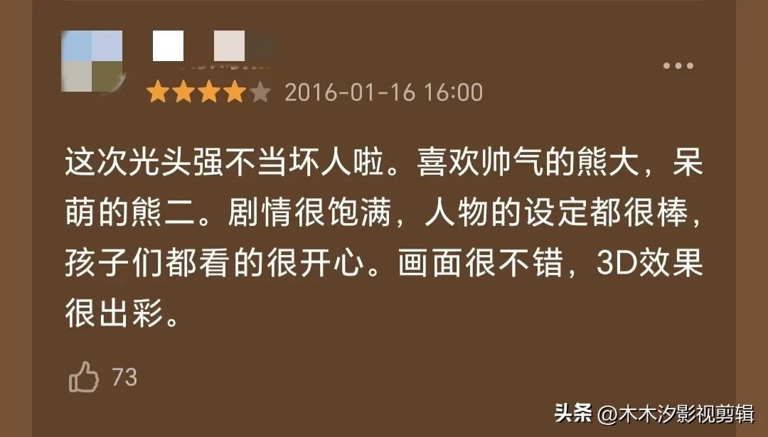 节奏紧凑,细节精巧,我笑的比小朋友都嗨。光头强塑造的特别丰富,小嘟嘟挤眉弄眼,人见人爱,这个角色的生动具有开创性。