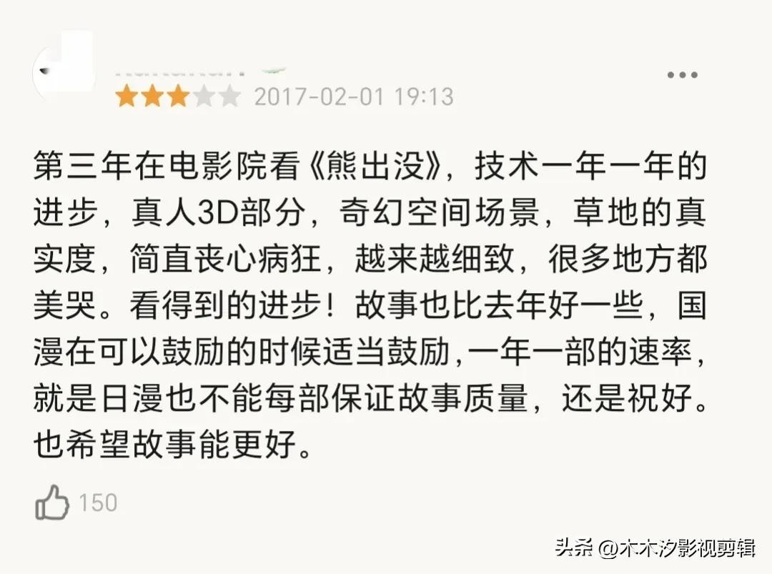 影评:第三年在电影院看《熊出没》,技术一年一年的进步,真人3D部分,奇幻空间场景,草地的真实度,简直丧心病狂,越来越细致,很多地方都美哭。