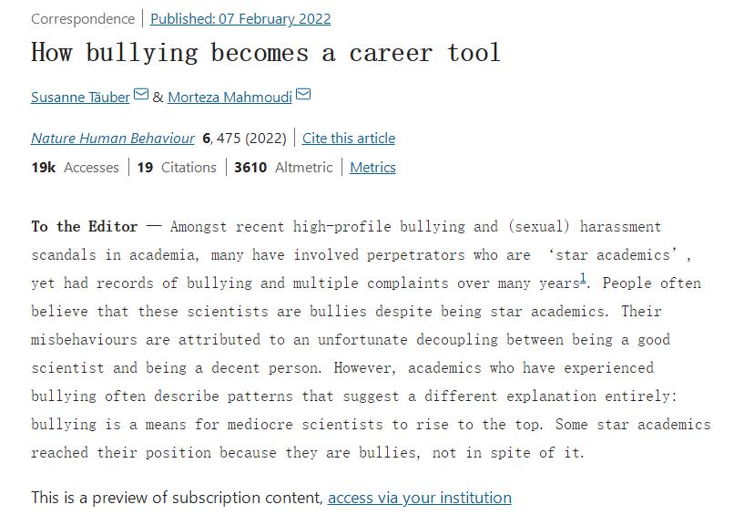 一篇来自 Nature Correspondence 的文章表示,许多所谓的「明星学者」之所以能够出人头地,正是因为他们在职业生涯中选择了当个坏人——霸凌行为,正是这些平庸的学者登上顶峰的手段。