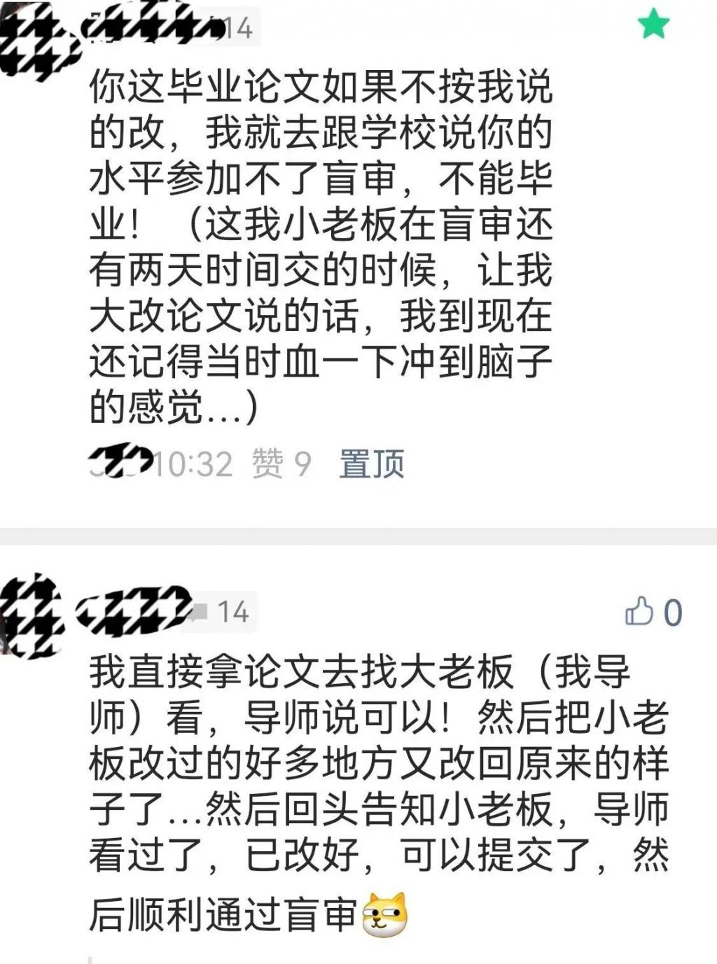 小老板在盲审还有两天时间交的时候,让我大改论文说的话:你这毕业论文如果不按我说的改,我就去跟学校说你的水平参加不了盲审,不能毕业。我到现在还记得当时血一下冲到脑子的感觉 ......