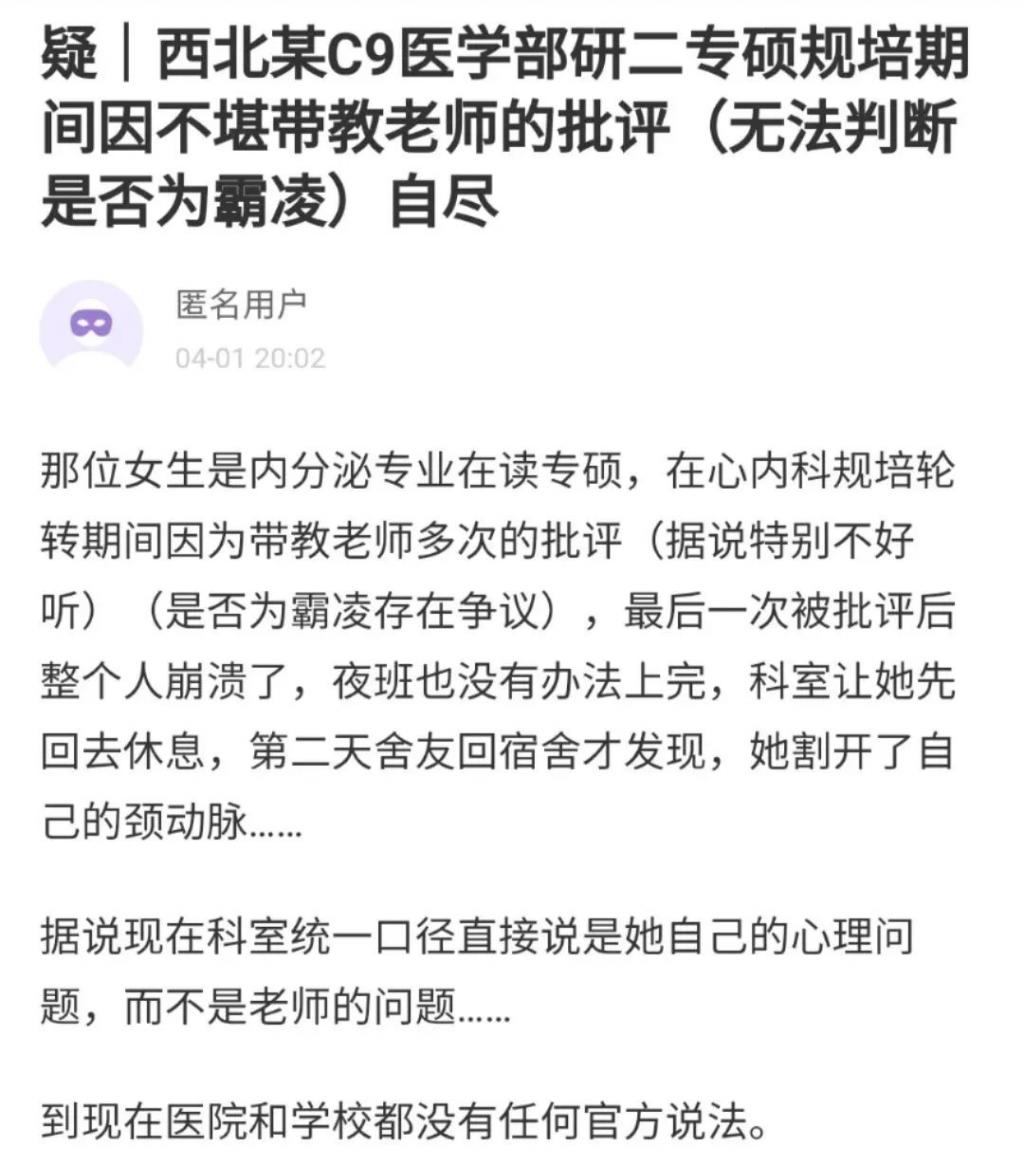 还有网传西交一附院一研二女生规培期因不堪带教老师 " 批评 ",在寝室刎颈自杀的事情。