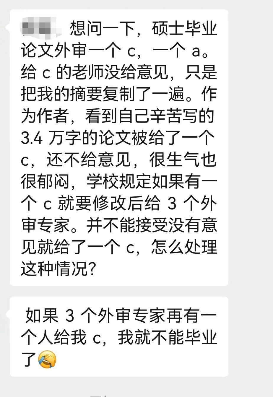 硕士毕业论文外审一个 c,一个 a。给 c 的老师没给意见,只是把我的摘要复制了一遍。作为作者,看到自己辛苦写的 3.4 万字的论文被给了一个 c,还不给意见,很生气也很郁闷,学校规定如果有一个 c 就要修改后给 3 个外审专家。并不能接受没有意见就给了一个 c。