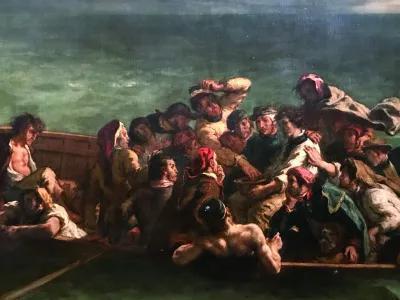 得救后的航船在海上漂流12天后,船上再也没有可吃的东西了,水手们便开始吃人,老弱者成了首先被吃的对象。唐璜不忍心吃他的老师,被迫跳海离开了航船。他在海水中奋力挣扎,游到了西克拉提兹群岛,被一位年轻貌美的姑娘救上了岸,把他藏在海边一个山洞中。