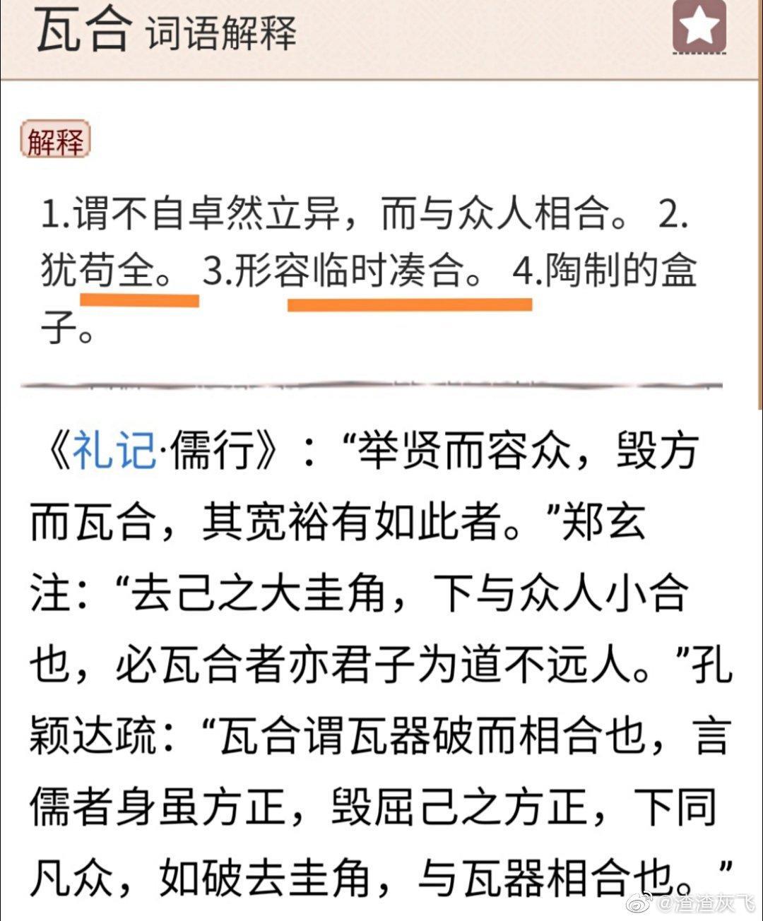 《辞源》释瓦合为“瓦器破而相合”,释瓦解为“瓦片碎裂”,义同“瓦裂”,皆以瓦器为喻,这是不妥的。