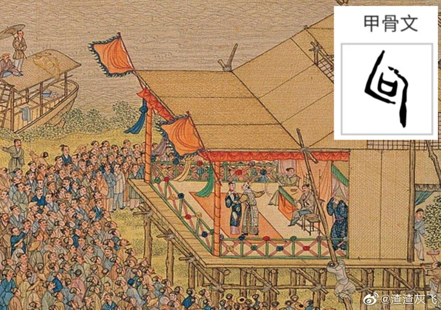 根据孟元老《东京梦华录》记载,其实勾栏的外型与方形木箱无异,四周围以板壁。我认为,勾栏作为表演舞台,正合了甲骨文“勾”的造形一一中间凹口表示舞台,外围两折线表示环绕舞台的观众。
