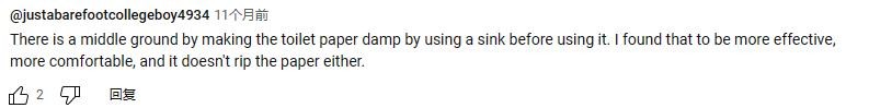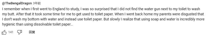 TheBengalDragon:记得我第一次去英国读书的时候,我很奇怪为什么厕所旁边没有找到用来洗屁股的水枪。之后我花了一些时间才习惯卫生纸。当我回到家时,我的父母很反感我不用水洗屁股,而是用卫生纸。但慢慢地我意识到使用肥皂和水比使用可溶解的卫生纸更卫生