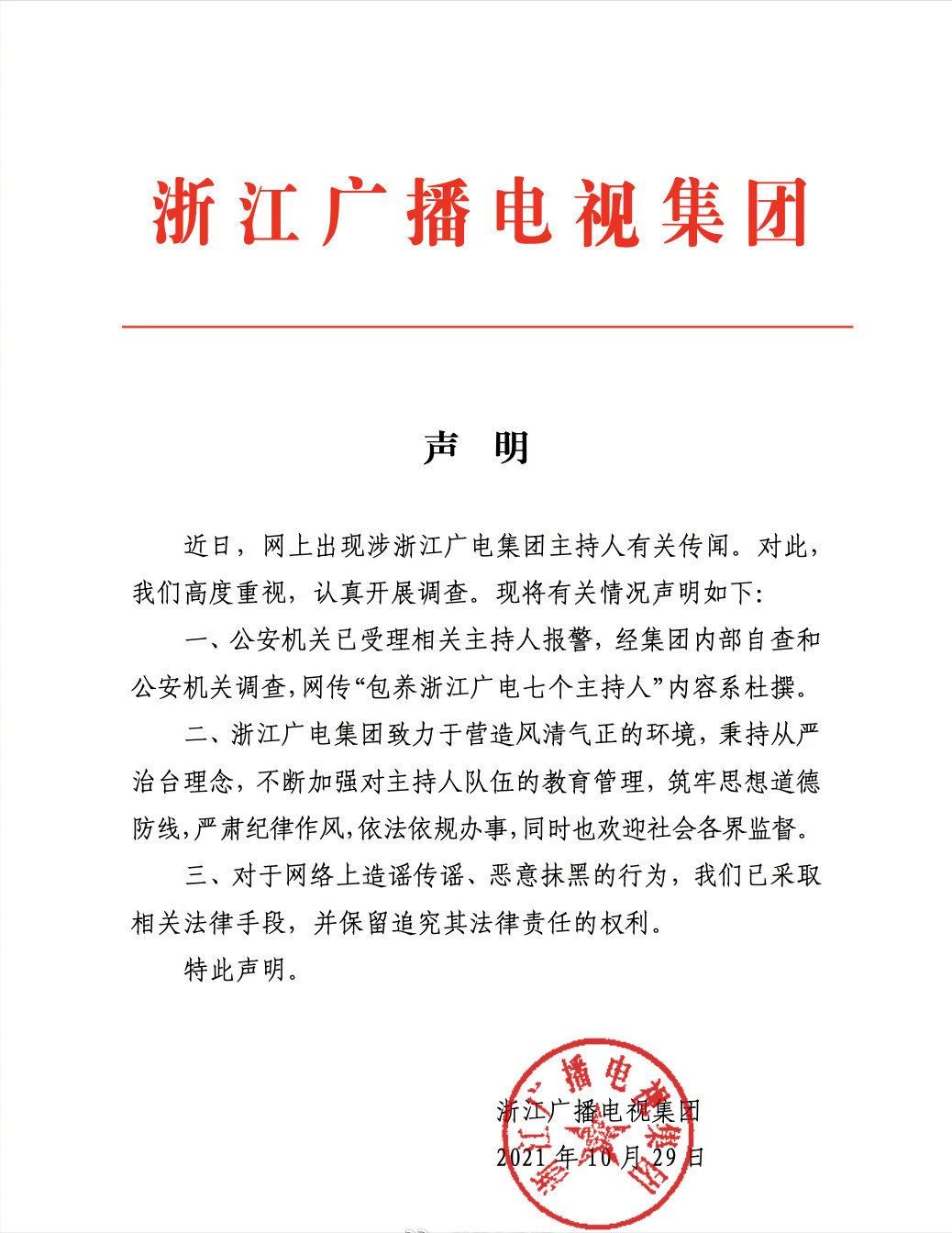 浙江卫视官方账号发布声明称,会不断加强对主持人队伍的教育管理,对于网上造谣传谣、恶意抹黑的行为,已采取相关法律手段,并保留追究相关法律责任的权利。