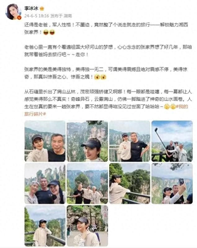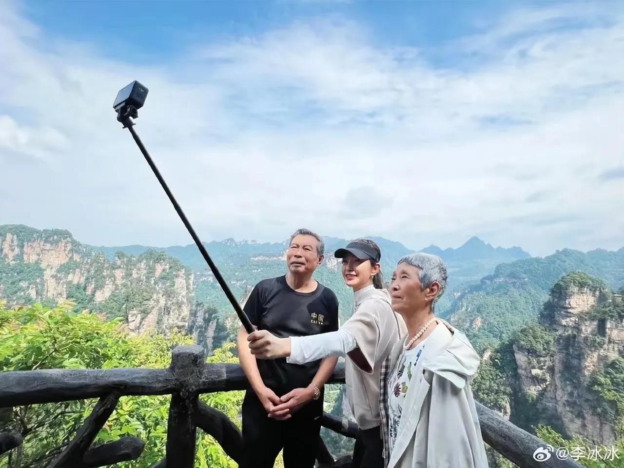 从李冰冰分享的照片中的可以看到,这次她带爸妈打卡湖南旅游景点,一家三口心情大好,玩得特别开心。