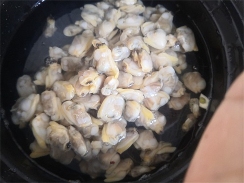 4、放完粉丝,加入足量的清水,然后放入洗好是花蛤肉。