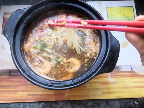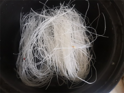 3、将洗干净的粉丝剪成2-3段,放入砂锅底部。