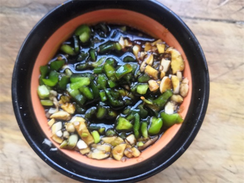 2、大蒜切成蒜末,去一半的量,青椒洗净切末,放入容器中,加入生抽、米醋、蚝油、白糖搅拌均匀。