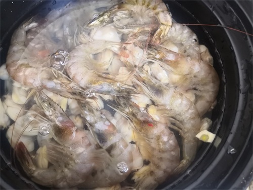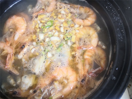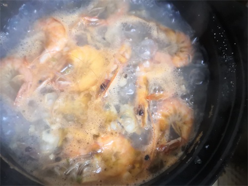 5、最后在砂锅里放入洗好的大青虾,大火加热。