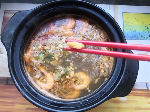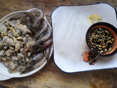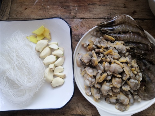 步骤:1、将解冻好的大青虾,清洗干净,去虾线和头部里的脏东西,花蛤肉清洗一下,粉丝也要洗一下,放一旁备用。