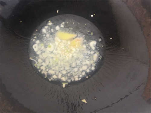 6、同时,另用一口炒锅,放入食用油,油热六成放入剩下的蒜末和姜片。