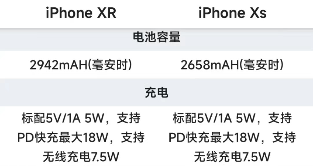 从手机的电池容量上来看,iPhone XR会稍微大一些,它的电池容量为2942毫安时,而iPhone Xs的电池容量为2658毫安时,不过从这两款手机的电池容量可以看出,这两款手机的容量都是比较小的,再加上长时间的使用电池更加不耐用了,都不属于续航好的手机,充电方面,支持的是最大18W快充的设计,并且都支持无线充电。