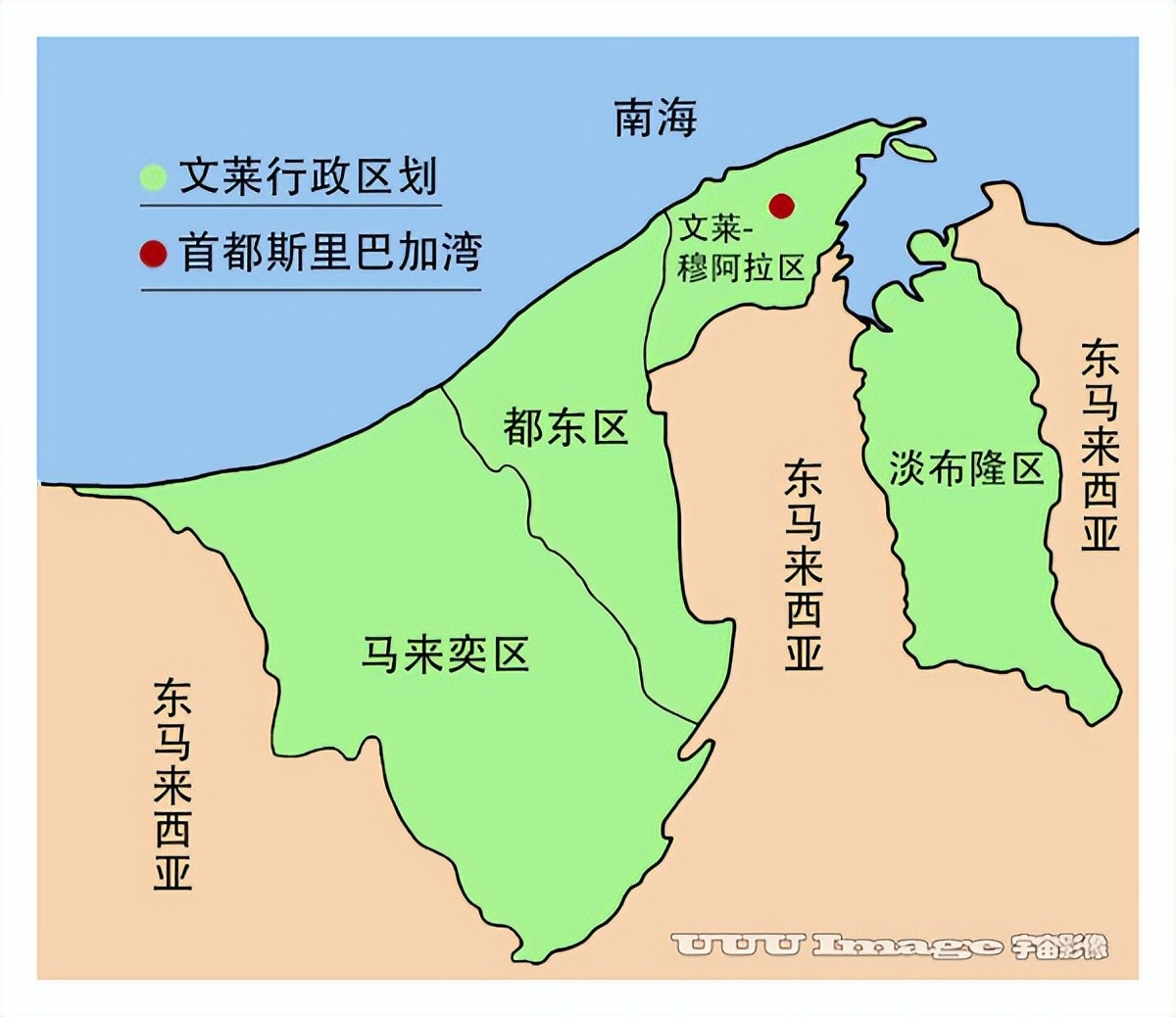 文莱全称文莱达鲁萨兰国,位于东南亚加里曼丹岛西北部。