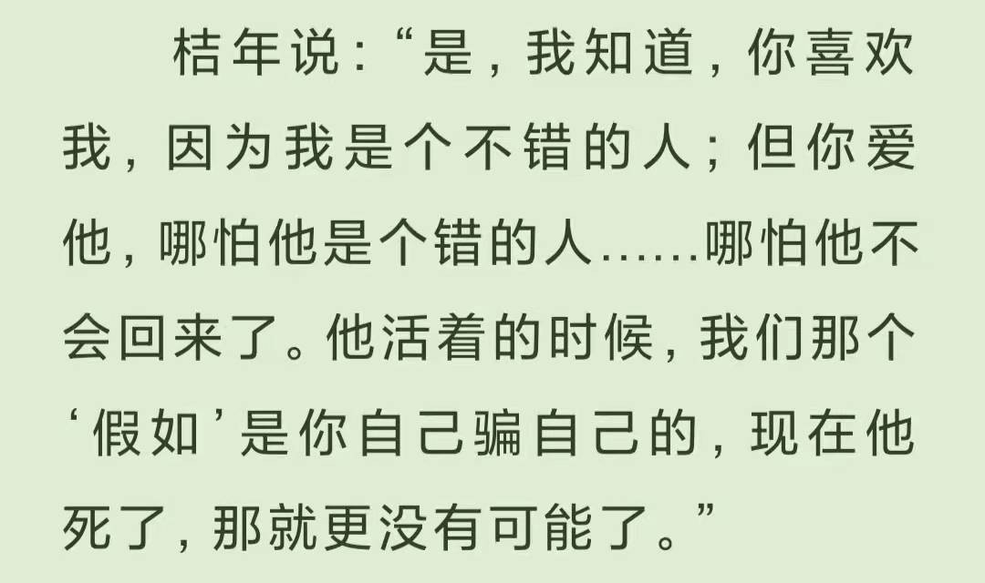 后来,巫雨和陈洁洁在一起了,桔年尽管感到诧异,但还是选择压住心中的感情不表。她和韩述像一场故事的两个看客一样,见证着陈洁洁和巫雨的疯狂。可在疯狂之后,短暂的平息的时候,桔年真诚地向巫雨说,不管以后他去哪儿,她希望能和他说一句再见。